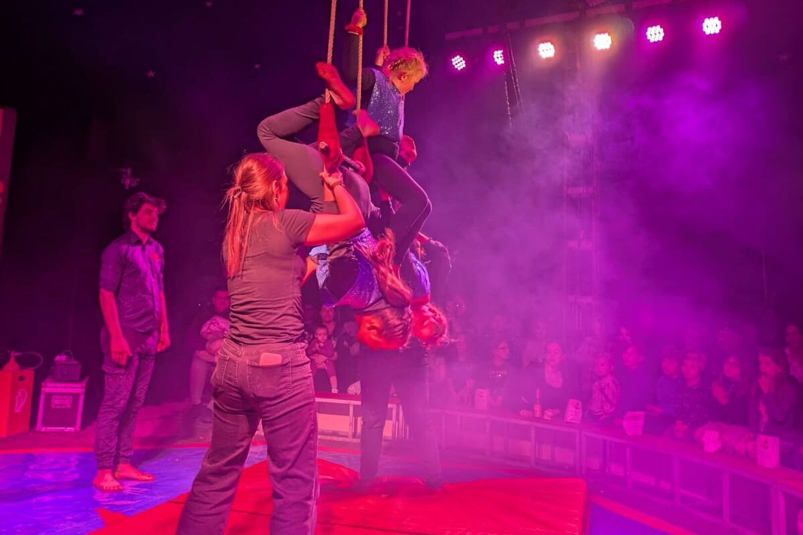 Ab dem ersten Montag der Osterferien gehörte das Zelt dann ganz den Kindern und Jugendlichen. Nach einem gemeinsamen Warm-Up präsentierten 18 „Teamer“ des pädagogischen Personals mit zwei Jugendlichen der Außenwohngruppe – die sich bereits Wochen zuvor in einer Fortbildung mit Zirkusdidaktik und -methodik vertraut gemacht hatten – den Kindern und Jugendlichen eine erste Show. Hinter dem Vorhang herrschte laute Aufregung, spontanes Agieren war gefragt. Die Unterstützung durch Applaus und Bewunderung von den Kindern und Jugendlichen war „ihren“ Alltagsbegleiterinnen und Begleitern sicher.